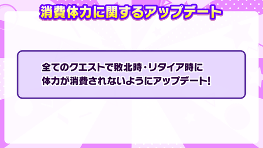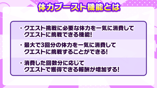 クエスト挑戦に必要な体力を一気に消費して、クエストに挑戦できる「体力ブースト機能」を追加しました。