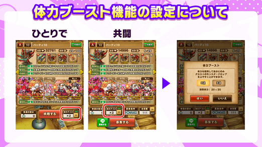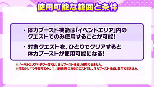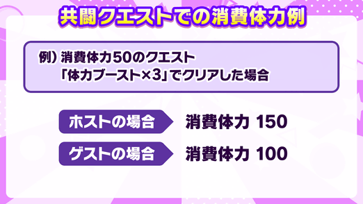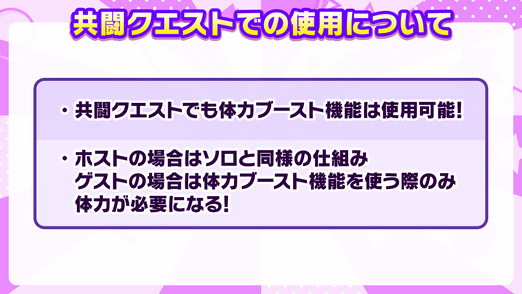 ※共闘クエストでも「体力ブースト機能」は使用可能となりますが、ホストとゲストで消費体力が異なります。
