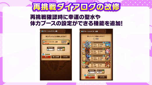 ◆再挑戦確認時に「幸運の聖水」や「体力ブースト」の設定ができる機能