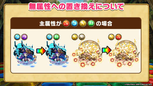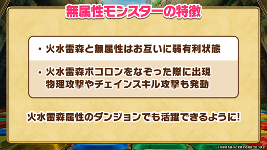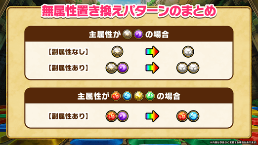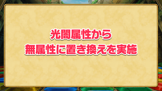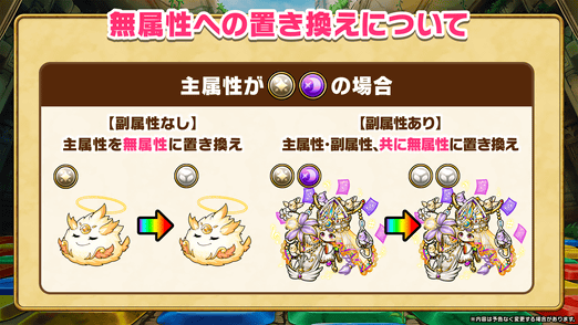 挑戦時にパーティに編成するモンスターに関する制限があるダンジョンにつきまして、特定属性の制限があるダンジョンに対しては無属性も編成できるようにします。対象ダンジョンの詳細につきましては、下記よりご参照ください。