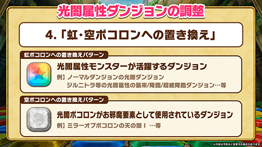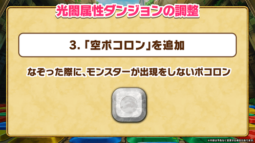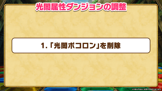 火水雷森属性が主軸となるダンジョンの内、光闇属性モンスターや光闇ポコロン等が出現するダンジョンにつきましては、プレイした際の難易度感が大きく変わらないように個別に調整を行います。