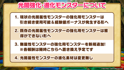 光闇属性のモンスターや装備につきまして、無属性への置き換えを実施します。無属性にすることで、既存の火水雷森属性が主軸となるダンジョンにおいても、光闇属性のモンスターや装備が活躍しやすくなる状態を目指します。