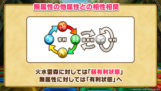 ※本改修に合わせて、無属性に対する属性相性の仕組みに変更を行います。これまで「火水雷森属性→無属性、無属性→火水雷森属性」に攻撃する際は「有利状態」となっておりましたが、本改修後は「弱有利状態」となります。