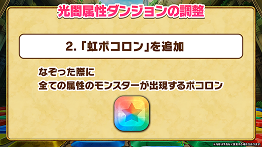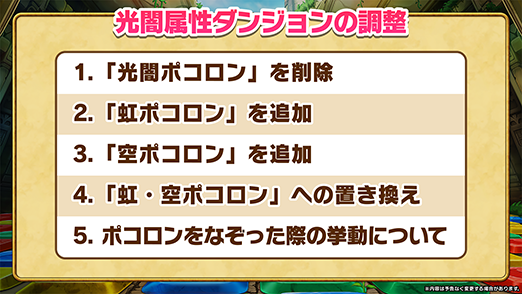 光闇属性のモンスターが登場するダンジョンや、光闇ポコロンが登場するダンジョンにつきましても調整を実施します。加えて、光闇ポコロンの置き換え先として新たに、虹ポコロン・空ポコロンを新規追加します。