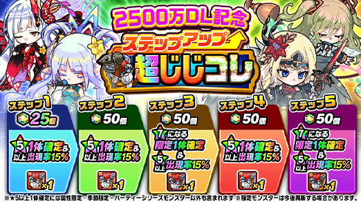 ・「2500万DL記念ステップアップ超じじコレ」に出現する「属性限定モンスター」「季節限定モンスター」「パーティーシリーズ」は今後のガチャでも再販する場合がございます。