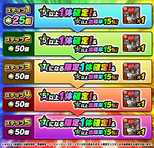 さらにステップ3、5では★7になる季節・属性・パーティーシリーズの限定モンスターが1体確定で出現するぞ!